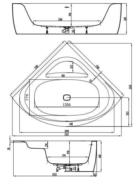 Wymiary: Długość: 1500 mm Szerokość: 1500 mm Wysokość: 600 mm Głębokość: 450 mm Pojemność: 302 l