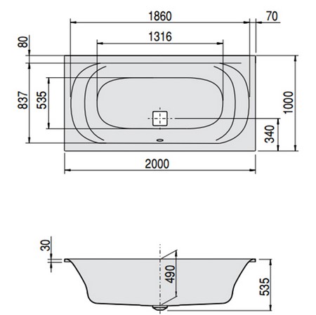 Długość: 2000 mm Szerokość: 1000 mm Długość wewnętrzna: 1860 mm Szerokość wewnętrzna: 837 mm Długość dna: 1316 mm Szerokość dna: 535 mm Głębokość: 490 mm Wysokość zabudowy wanny: 640-680 mm Wysokość instalacji wanny z hydromasażem: 650-690 mm Pojemność: 220 l