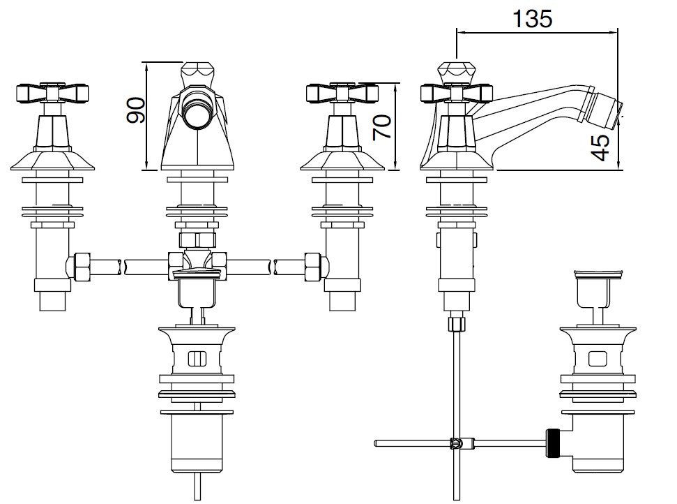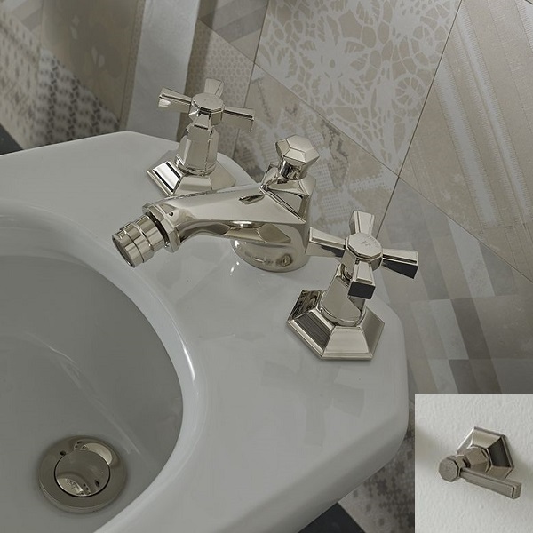 3-otworowa bateria bidetowa, obrotowa wylewka z perlatorem, korek 1 ¼, wężyki elastyczne.