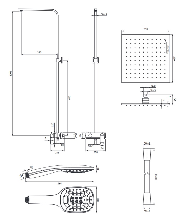Omnires Sacramento Zestaw prysznicowy ścienny z deszczownicą na drążku 250x250 mm i słuchawką prysznicową Czarny SC2344BL