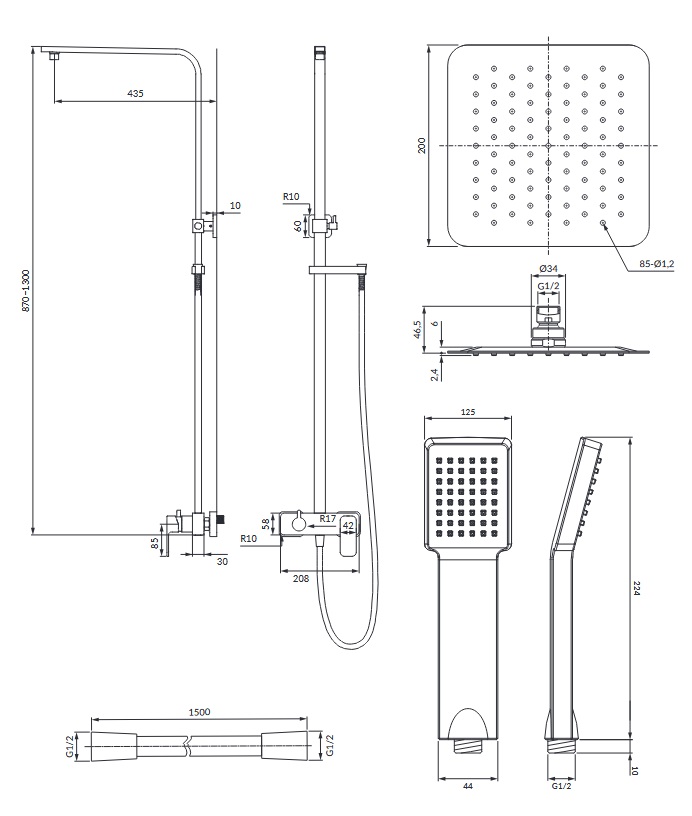 Omnires Apure Zestaw prysznicowy ścienna z deszczownicą 200x200 mm na drążku i słuchawką prysznicową Chrom AP2244CR