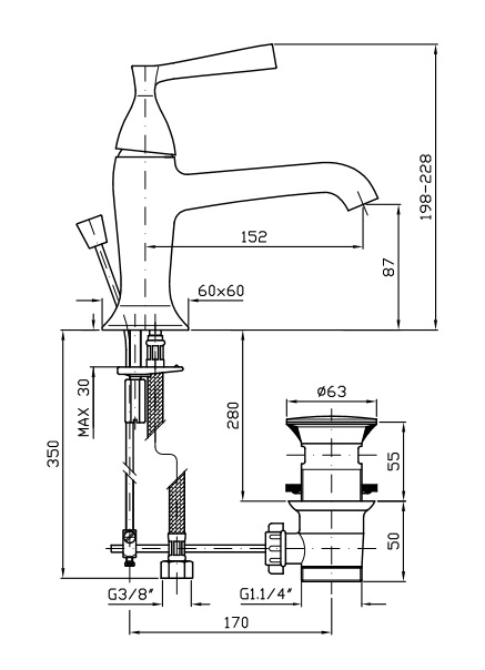 Jednouchwytowa bateria umywalkowa z perlatorem, korek 1 ¼”, wężyki elastyczne.