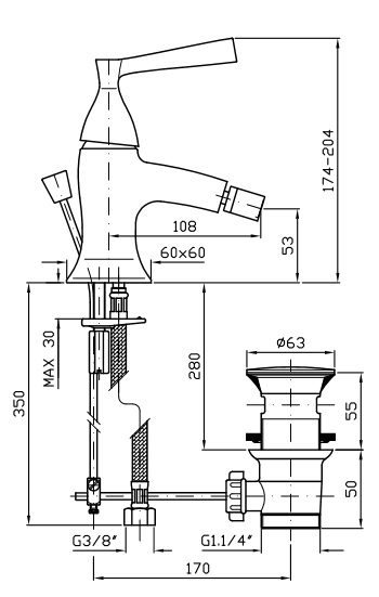 Jednouchwytowa bateria bidetowa z perlatorem, korek 1 ¼”, wężyki elastyczne