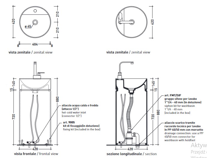 W komplecie z zestawem do mocowania do podłogi nr art. 9005 i syfonem nr art. FMT/SIF