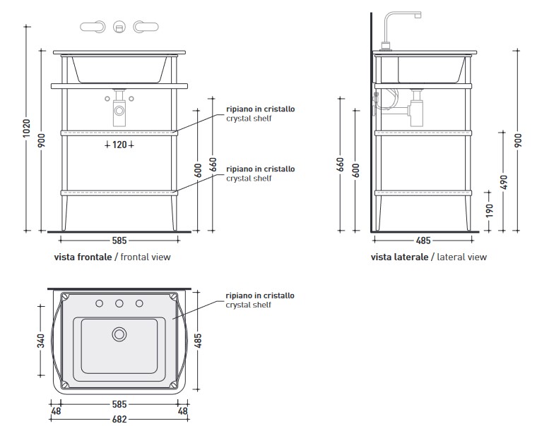 Z metalu z 2 szklanymi półkami Kolor: Chrom Istnieje możliwośc zakupu produktu w kolorze czarnym Wymiary: Długość: 48,5 cm Szerokość: 68,2 cm Wysokość: 90 cm Waga: 26 kg