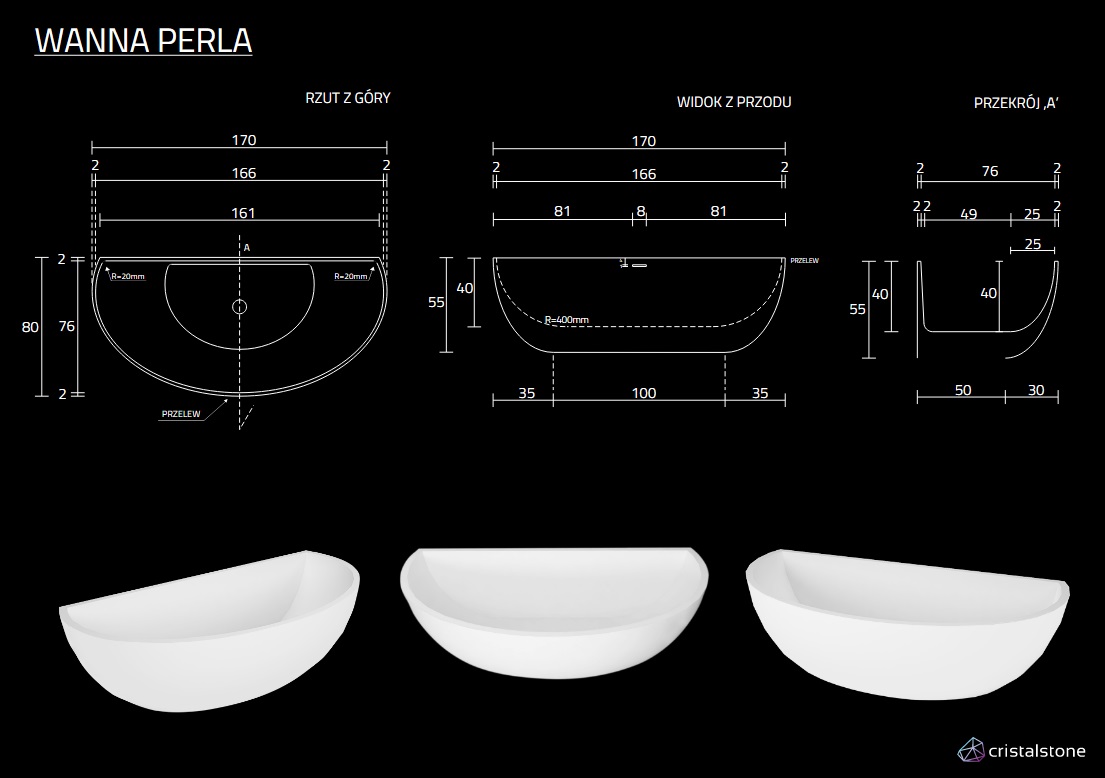 Cristalstone Perla Wanna wolnostojąca przyścienna 170x80 Biały mat PERLA