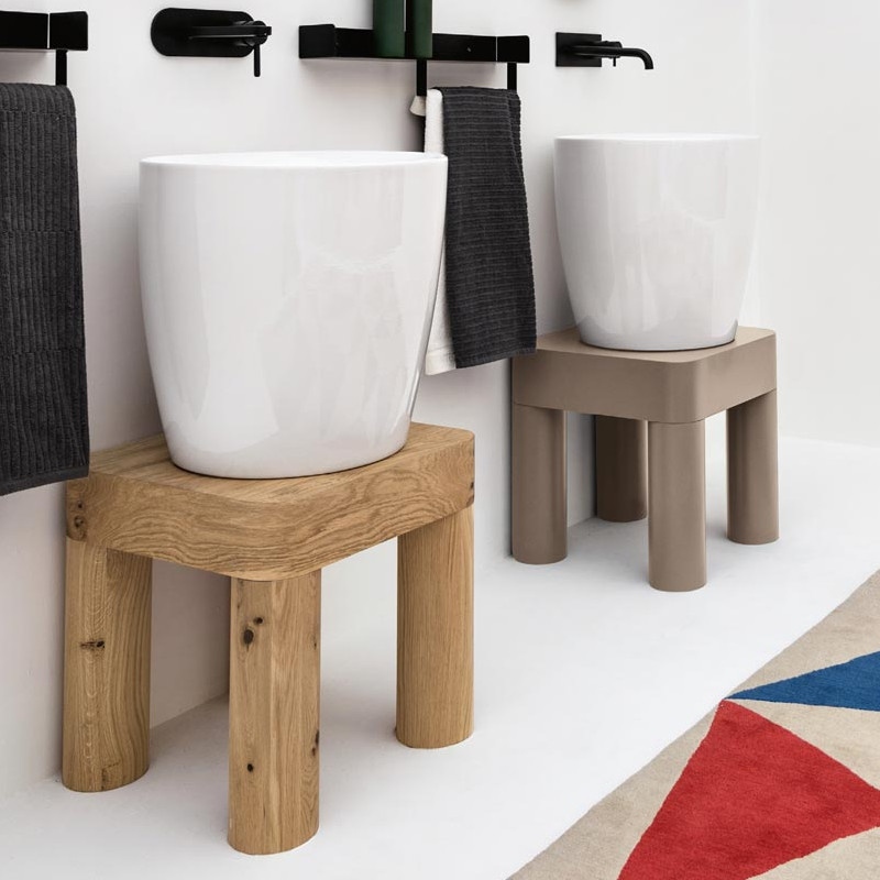 Axa KRACKLITE Umywalka stawiana na blat ∅ 46 cm z korkiem Click-clack oraz stojakiem drewnianym Biały połysk/Oak 8050001+AF0015+SG8050020