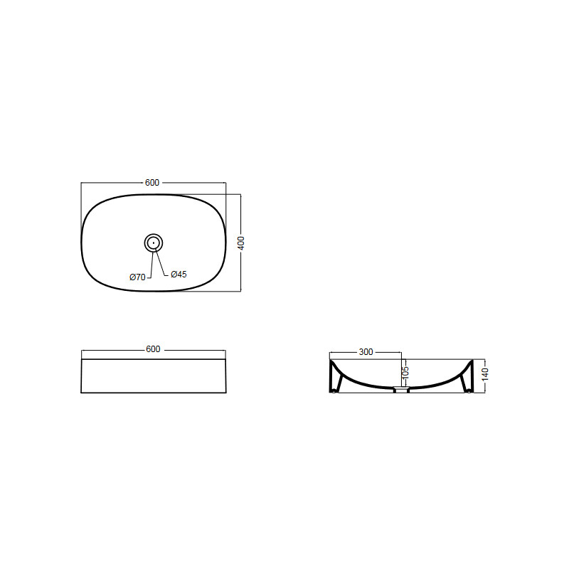 Wymiary: Szerokość: 60 cm Długość: 40 cm Wysokość: 14 cm Cena dotyczy umywalki z korkiem