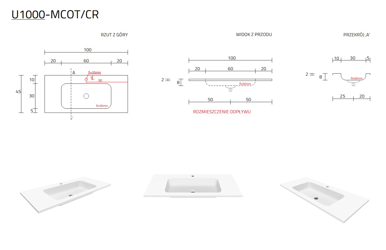 Cristalstone Linea Simpla Umywalka wpuszczana w blat Biały U1000-MCOT/CR