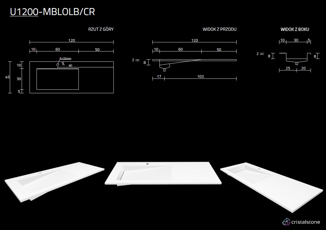 Cristalstone Linea Ideal Umywalka wpuszczana w blat Biały U1200-MBLOLB/CR