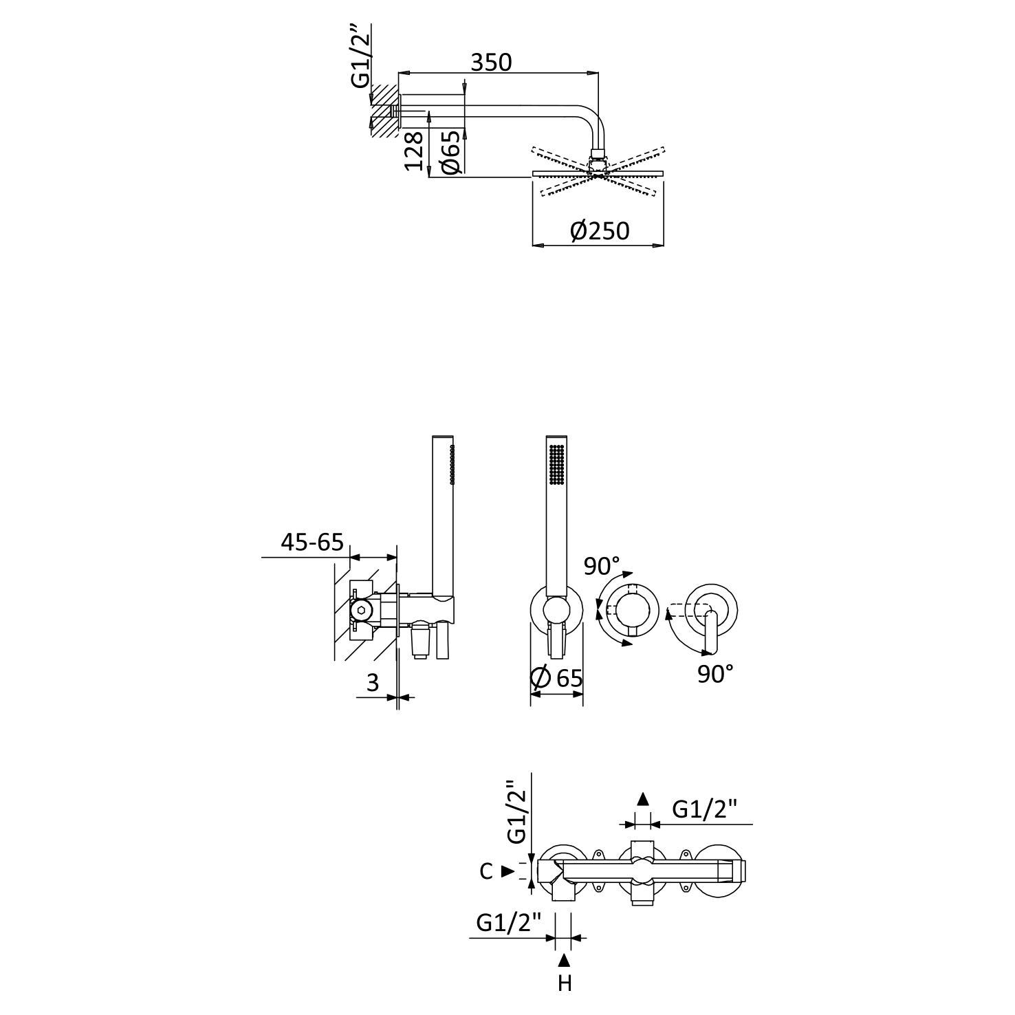 Zestaw zawiera mieszacz, słuchawkę, wąż oraz deszczownicę na ramieniu ściennym
