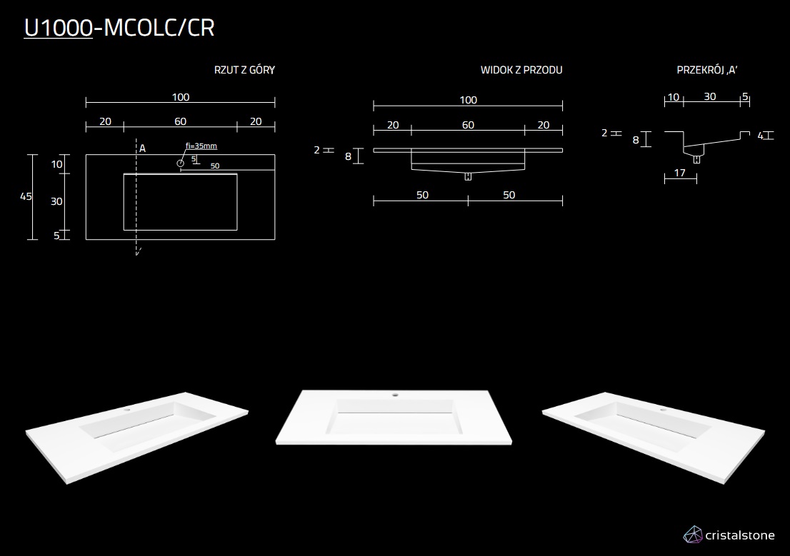 Cristalstone Linea Ideal Umywalka wpuszczana w blat biała U1000-MCOLC/CR
