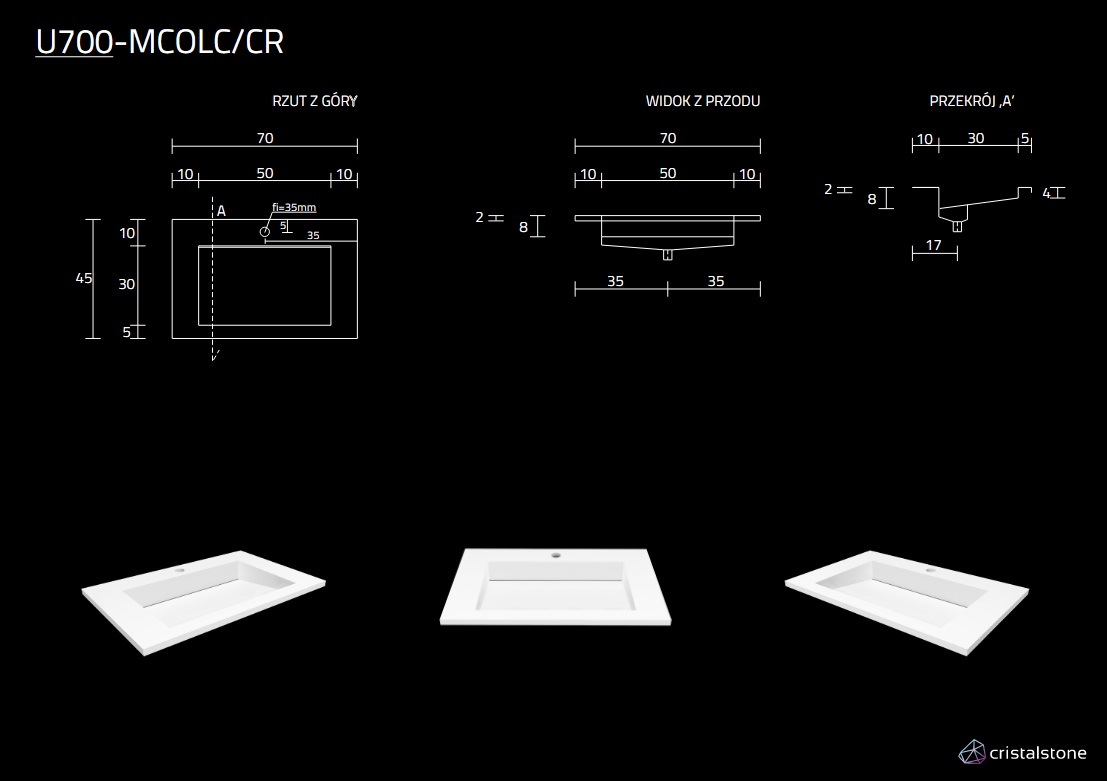 Cristalstone Linea Ideal Umywalka wpuszczana w blat Biały U700-MCOLC/CR