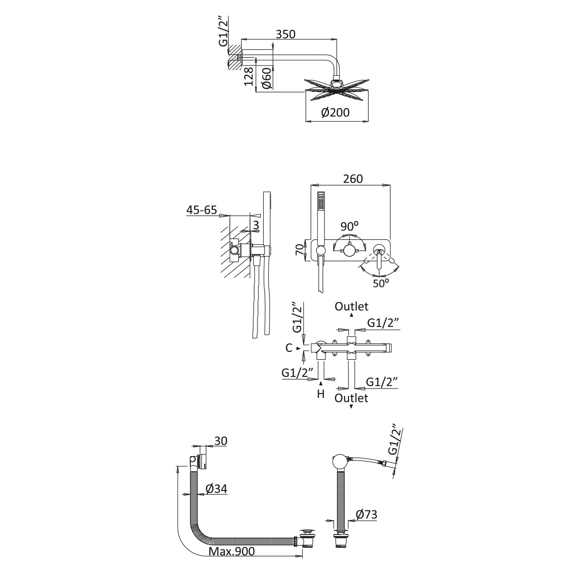 Zestaw zawiera baterię, mieszacz, słuchawkę, wąż oraz deszczownicę na ramieniu ściennym