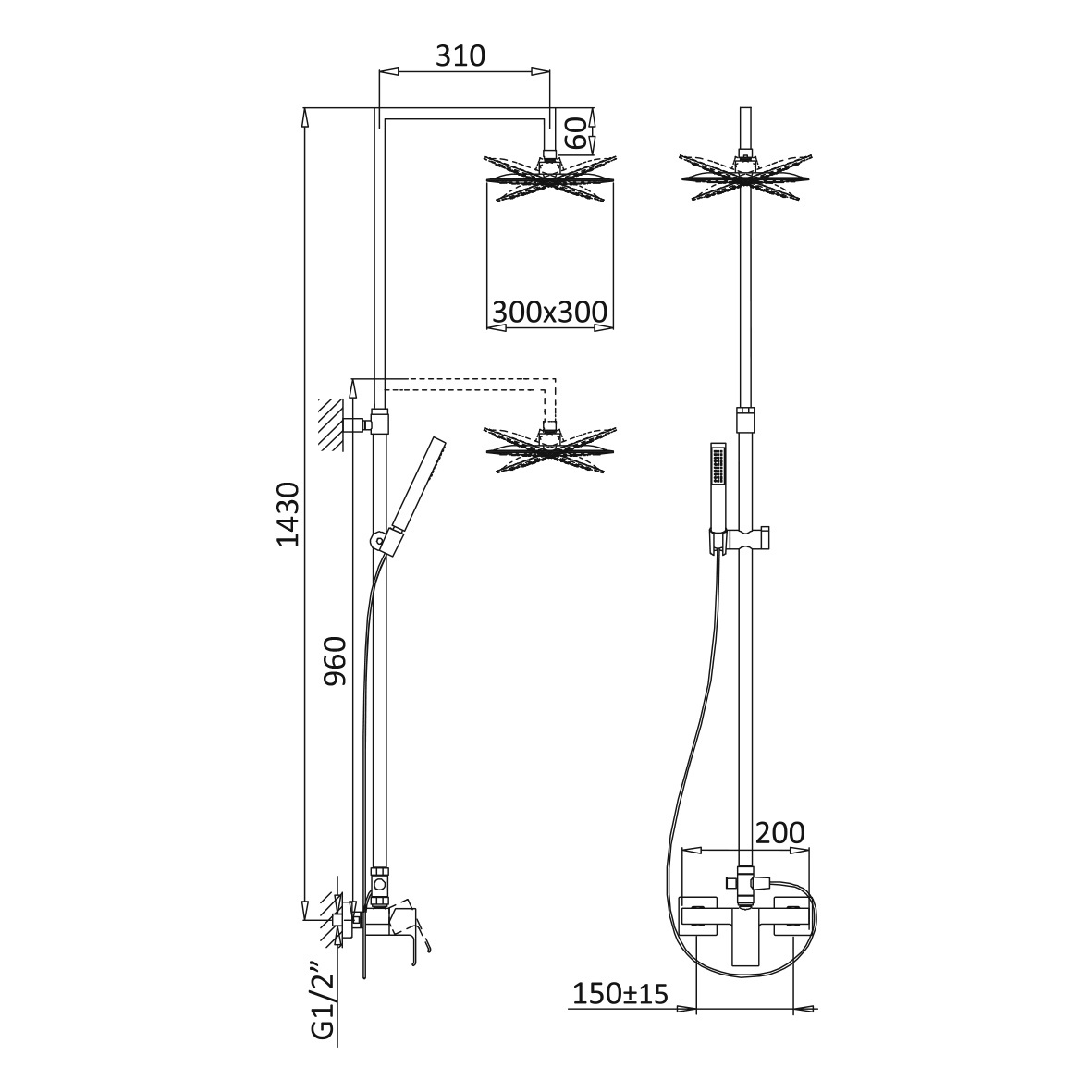 Zestaw składający się z baterii natryskowej, deszczownicy, ramienia ściennego, słuchawki i węża.