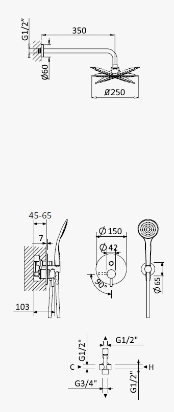 Zestaw natryskowy z deszczownicą, słuchawką typu "patyczek", ramieniem i baterią podtynkową