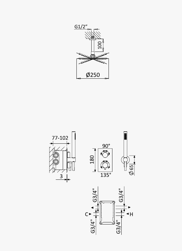 Zestaw natryskowy z ultracienką deszczownicą ze stali nierdzewnej, ramieniem i baterią podtynkową
