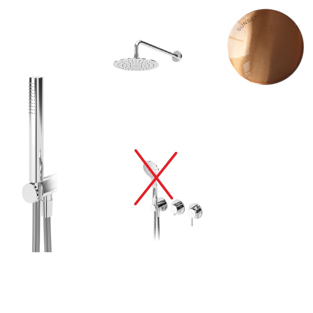 Zestaw natryskowy z deszczownicą, słuchawką typu "patyczek", ramieniem i baterią podtynkową