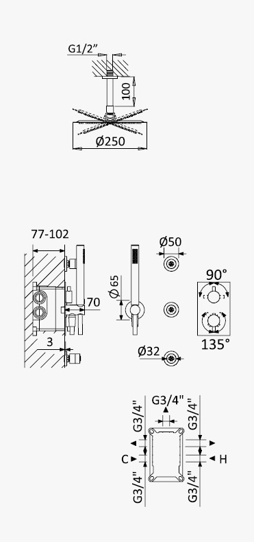 Zestaw natryskowy z deszczownicą, ramieniem, 3 dyszami bocznymi, baterią podtynkową i słuchawką
