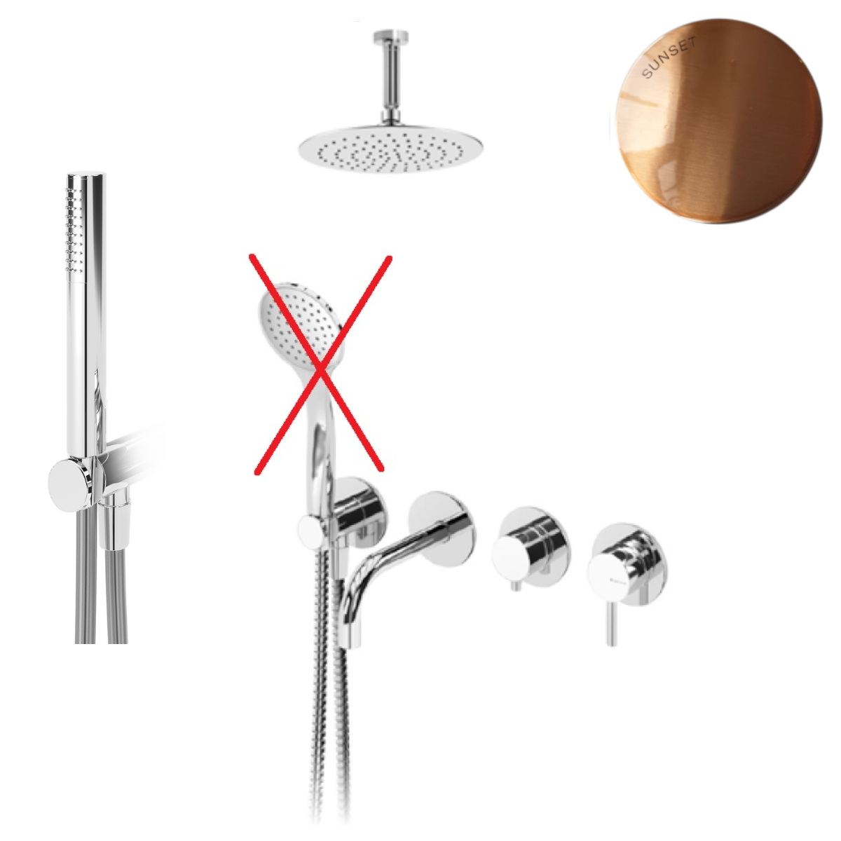 Zestaw składający się z baterii, ultracienkiej deszczownicy ze stali nierdzewnej, węża i ramienia sufitowego