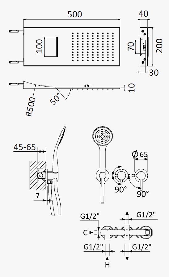 Zestaw składający się z baterii jednouchwytowej, deszczownicy Line Cascade i słuchawki