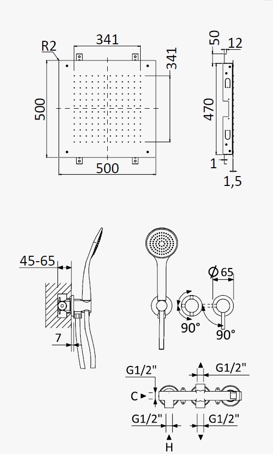 Wymiary:Szerokość deszczownicy: 500x500 mm
