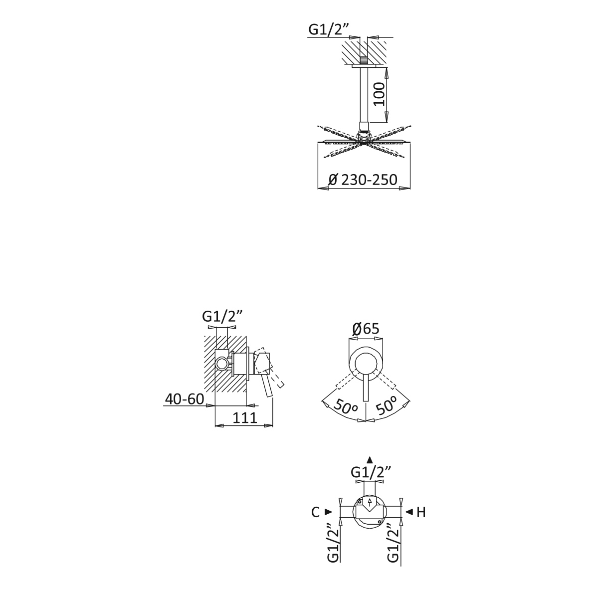 Bruma Lusitano Zestaw prysznicowy podtynkowy z deszczownicą Ø 250 mm i ramieniem sufitowym Sunset 1075602SS