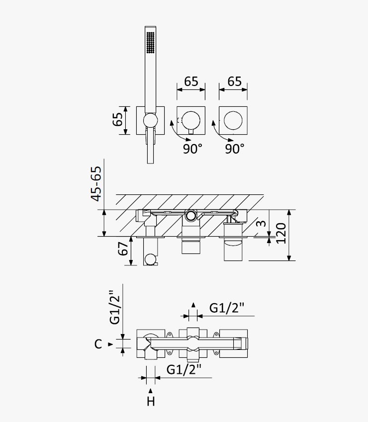 Bateria 2-drożna podtynkowa z elementem podtynkowym w zestawie.