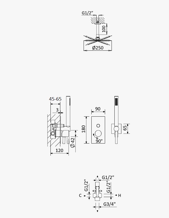 Bateria natryskowa podtynkowy, ze słuchawką prysznicową typu "patyczek", z deszczownicą