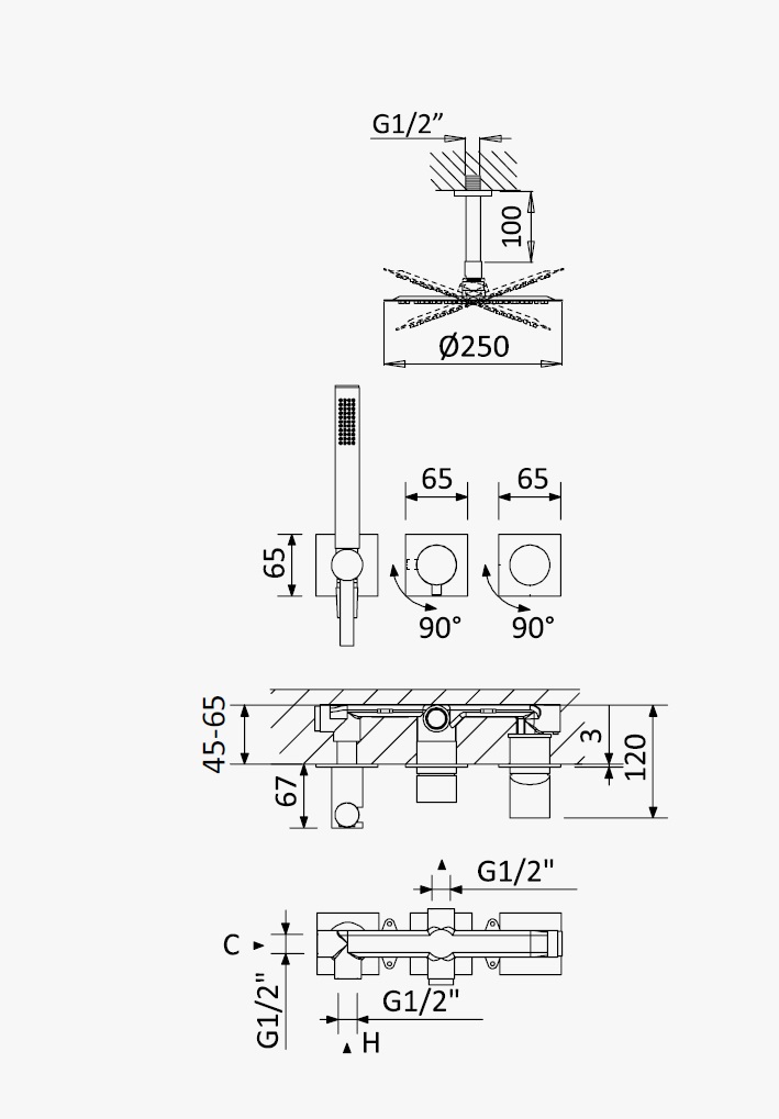Bateria natryskowa podtynkowy, ze słuchawką prysznicową typu "patyczek", z deszczownicą