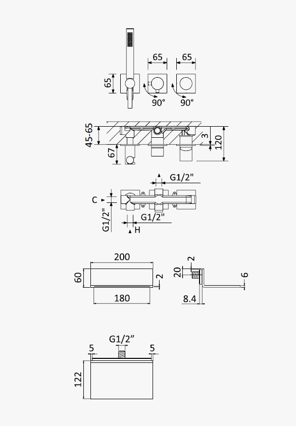 Bateria natryskowa podtynkowy, ze słuchawką prysznicową, z natryskiem kaskadowym