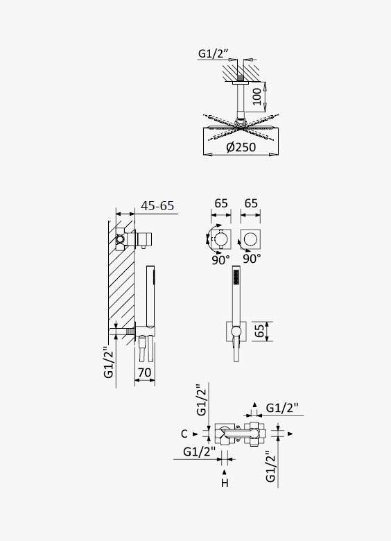 Bateria natryskowa , ze słuchawką prysznicową typu "patyczek", z deszczownicą sufitową