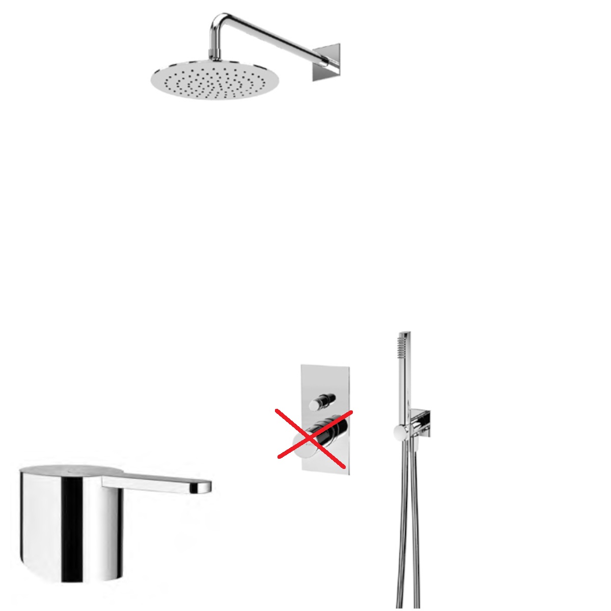 Zestaw natryskowy z deszczownicą, ramieniem, baterią i słuchawką.
