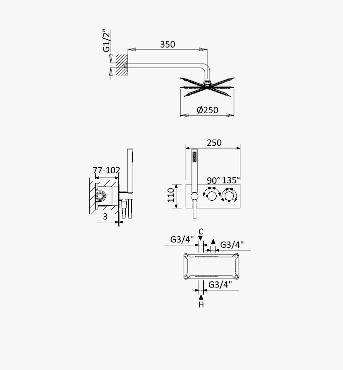 Bateria natryskowa podtynkowy, ze słuchawką prysznicową, z deszczownicą ścienną