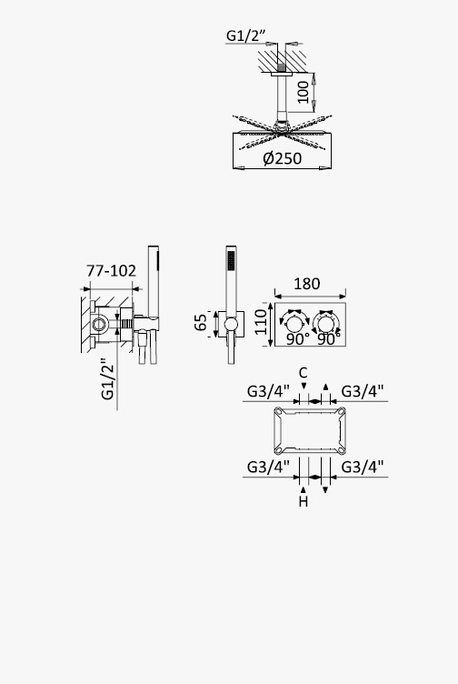 Bateria natryskowa , ze słuchawką prysznicową typu "patyczek", z deszczownicą sufitową