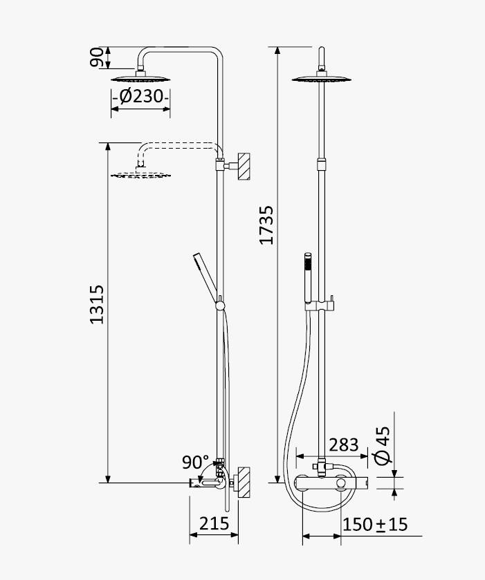 Bateria wannowo-natryskowa z deszczownica, wężem i słuchawką