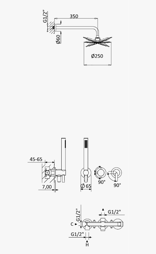 W skład zestawu wchodzi: deszczownica ścienna, bateria podtynkowa, zestaw natryskowa, uchwyt