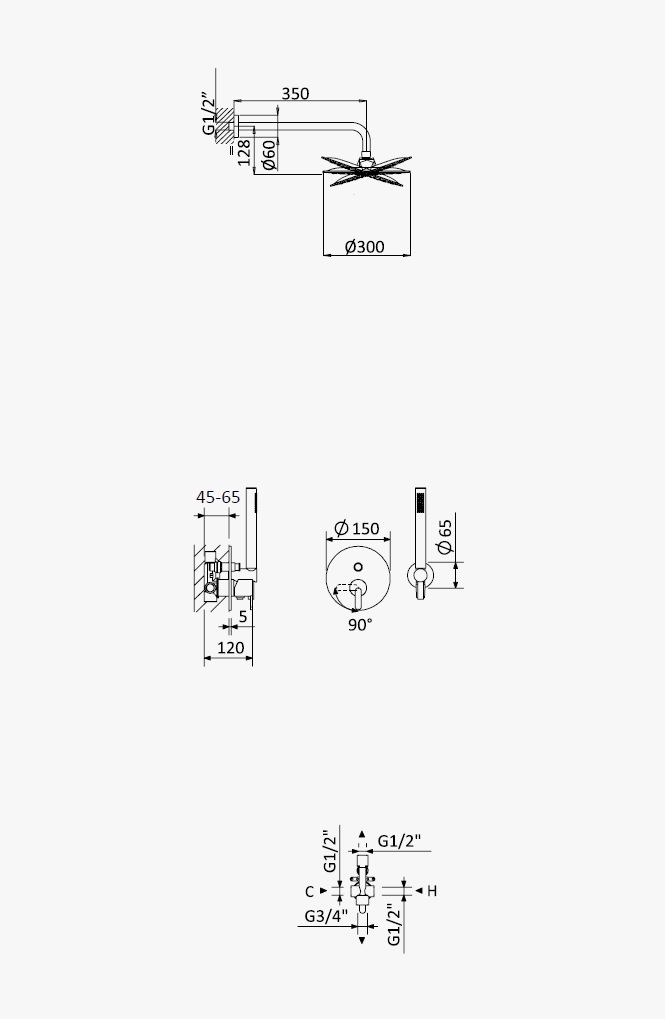 w skład zestawu wchodzi: deszczownica ścienna, bateria podtynkowa, słuchawka, wąż i przyłącze z uchwytem