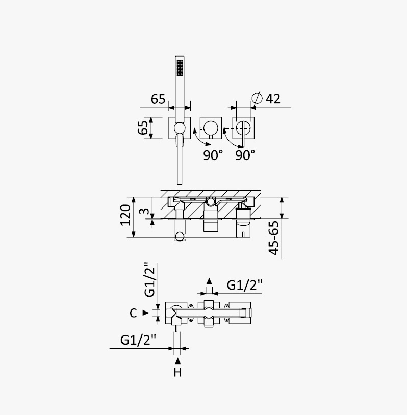 Bateria 2-drożna podtynkowa z elementem podtynkowym oraz słuchawką w zestawie.