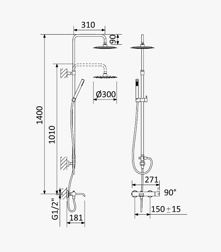 Zestaw natryskowy z deszczownicą, ramieniem, baterią i słuchawką