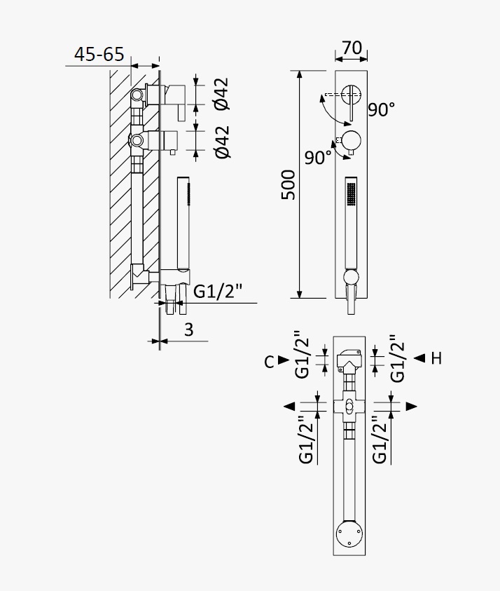 Bateria z 3-wylotami, podtynkowa z elementem podtynkowym w zestawie.