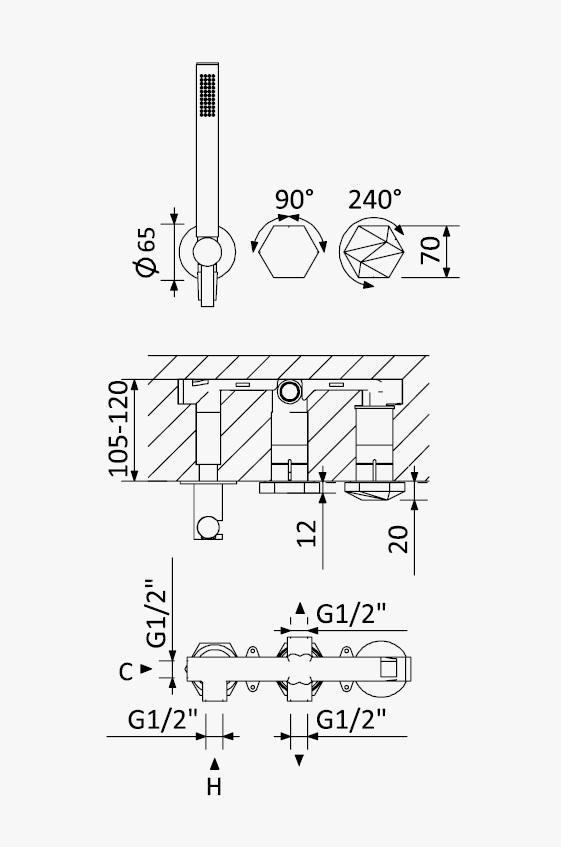 Bateria 3-drożna podtynkowa z elementem podtynkowym
