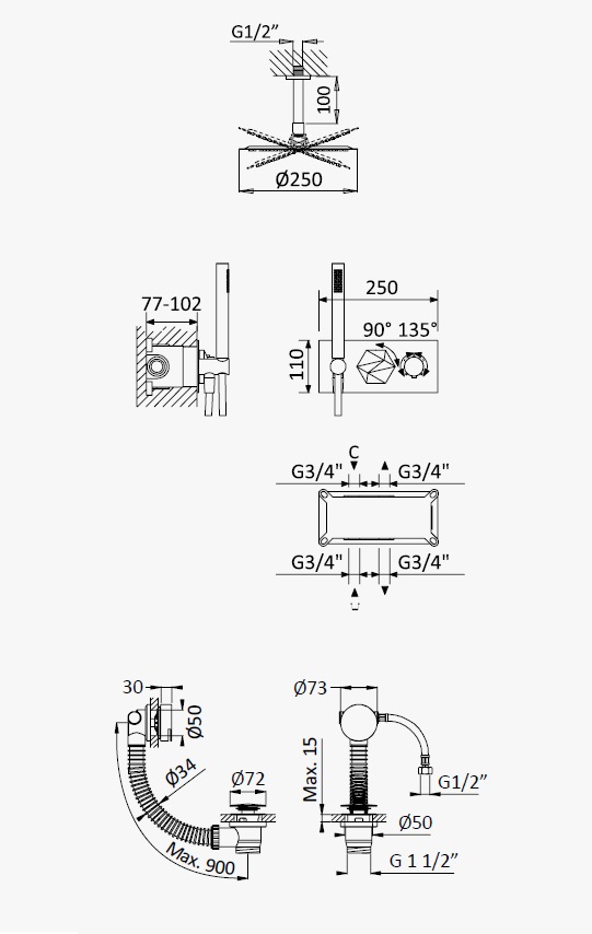 Bateria podtynkowa termostatyczna z elementem podtynkowym z deszczownicą sufitową,