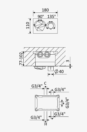 Przełącznik 3-drożny, podtynkowy z elementem montażowym podtynkowym w komplecie.