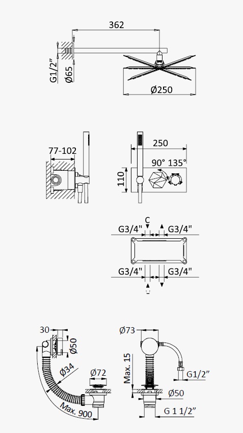 Bateria podtynkowa termostatyczna z elementem podtynkowym z deszczownicą ścienną,