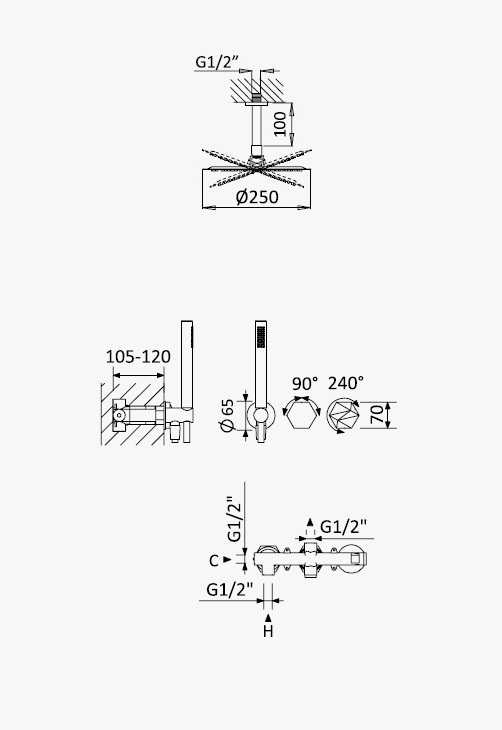 Bateria podtynkowa z elementem podtynkowym z deszczownicą sufitową na ramieniu,