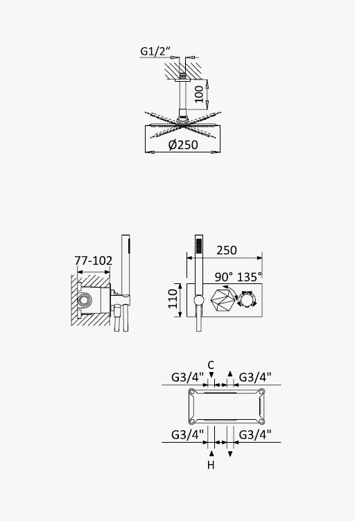 Bateria termostatyczna podtynkowa z elementem podtynkowym z deszczownicą sufitową na ramieniu,