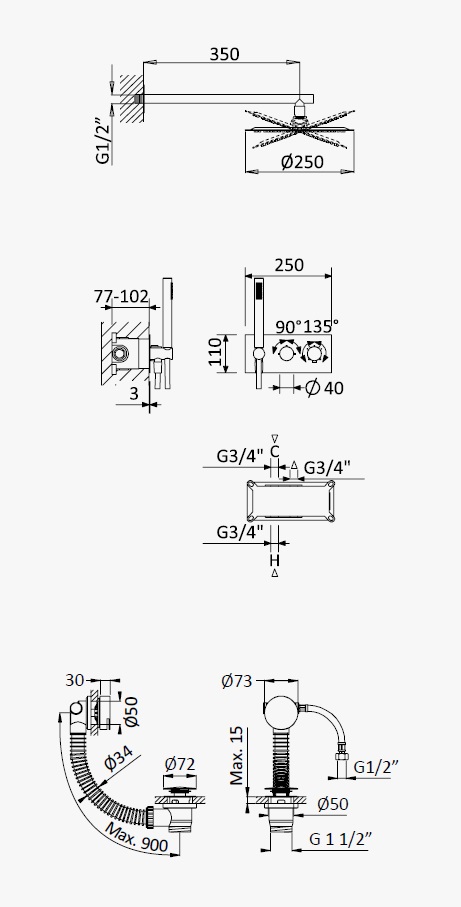 Bateria termostatyczna podtynkowa, z napełniaczem przez przelew, z deszczownicą ścienną i słuchawką prysznicową