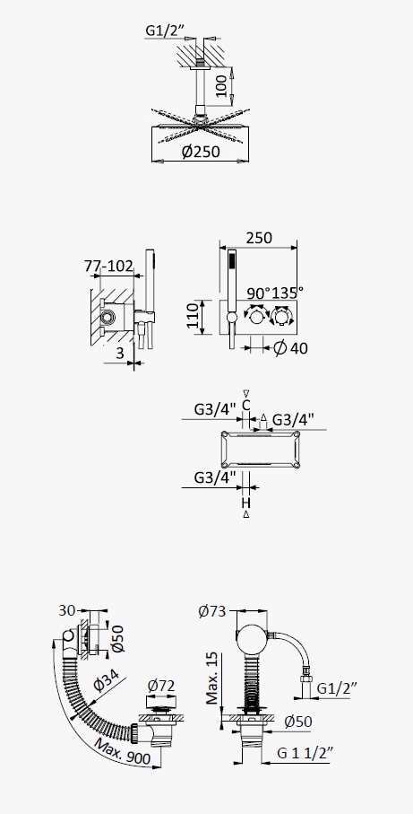 Bateria termostatyczna podtynkowa, z napełniaczem przez przelew, z deszczownicą sufitową i słuchawką prysznicową