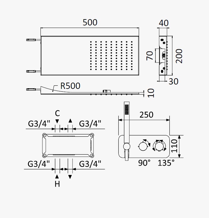 Bateria termostatyczna podtynkowa, z deszczownicą ścienna i słuchawką prysznicową
